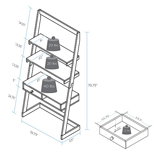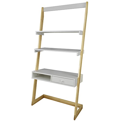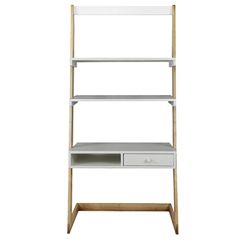 Crisp and clean, our Freestanding Ladder Desk is a progressive approach that combines modern design with classic functionality. The two tone design balances the white center with the natural texture of solid American maple side beams to form an elegant duo. The 2 top shelves provide plenty of space to organize your workspace or showcase your photos and decor. The spacious lower desk is perfect for all things producitvity and sits atop a lower shelf and drawer. A bright and sophisticated storage solution for apartments, bedrooms, offices, and more. Made with solid wood and solid American maple beams for natural beauty and durability that can withstand constant use.Modern two tone ladder design complements clean white surfaces with natural hardwood side beams. Simple and easy assembly with all hardware included