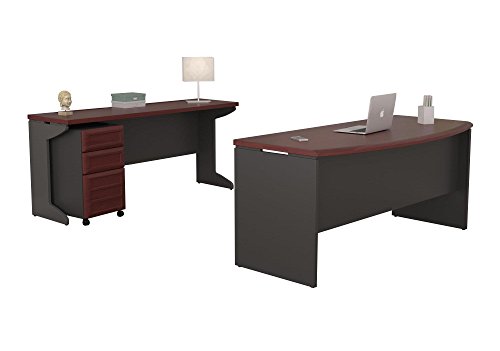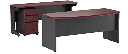 Create the perfect workspace at home or at the office with the commercial grade Ameriwood Home Pursuit Office Set with Mobile File Cabinet. The set contains the Pursuit executive desk, credenza and mobile file cabinet. The executive desk and credenza connect to form an extended L-shaped desk with double the work surface, and the mobile file cabinet offers much-needed storage space with a large drawer for paperwork and 2 small drawers for supplies and other office essentials. The mobile file cabinet also has 5 caster wheels for convenient movement. Additionally, the desk and credenza include side wire management panels and a wire trough under the desktop to keep cords from tangling. With subtle curved lines and a gray and cherry two-tone finish, this office set will fit beautifully in any space. The desk and credenza are constructed of durable PVC with a hollow core, and the file cabinet is made of MDF and particleboard. Assembly is required, and once together the desk is 29”h x 66”w x 29.5”d, the credenza is 29”h x 66”w x 19.5”d and the mobile file cabinet is 26.5”h x 15.375”w x 18.3125”d.The Ameriwood Home Pursuit Office Set with Mobile File Cabinet offers a wide work surface and storage for your perfect office environment