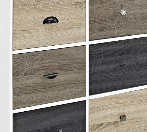 The white finish is accented by 6 multicolored woodgrain door fronts ranging from beige to black