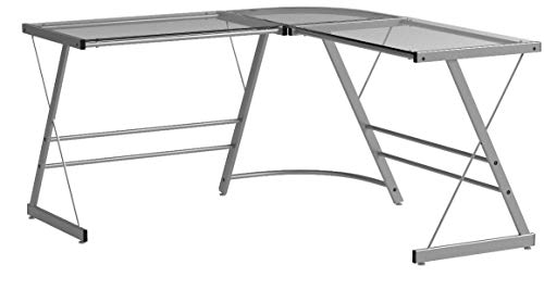 Talk about modern conveniences. This contemporary-style desk has a sleek glass work surface and streamlined gray metal frames. It fits perfectly in a corner and provides ample space for your computer, papers and books. And you get extra credit for great taste.Glass top work surface