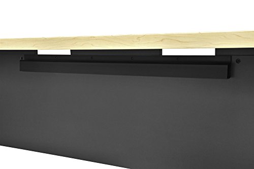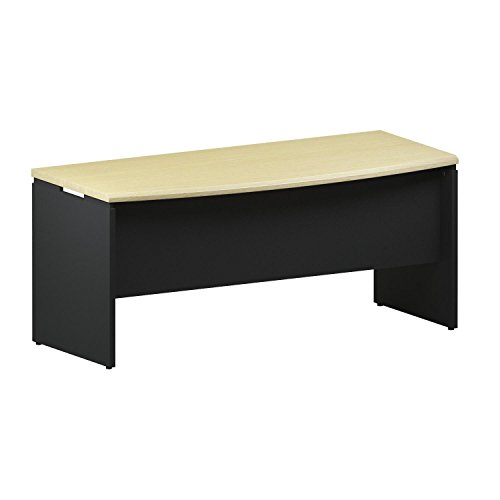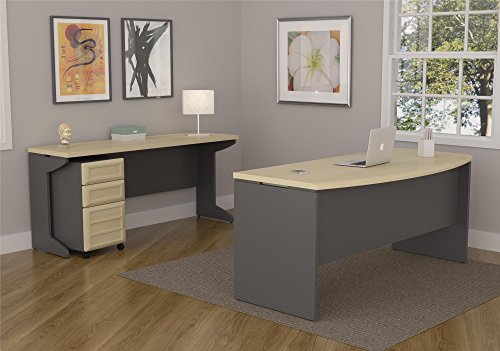 The Ameriwood Home Pursuit Executive Desk brings subtle beauty to your home office. The desk’s simple structure, curved lines and two-tone gray and light brown finish form a stunning minimalist design that will fit seamlessly into your office decor. The desktop is wide enough for a computer, printer and other office essentials. Additionally, side wire management slots and a trough below the desktop keep cords from tangling. The desk is made from sturdy, water-resistant PVC and a laminated hollow core. Assembled dimensions are 29”h x 66”w x 29.5”d. Connect Pursuit’s matching bridge table and hutch (both sold separately) to expand your workspace and add storage.