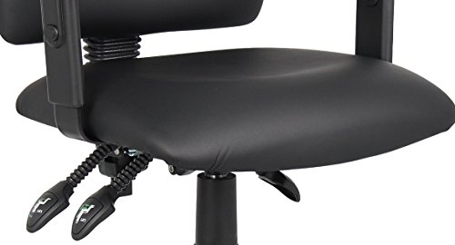 Upholstered in Black LeatherPlus. Back angle lock allows the back to lock throughout the angle range for perfect back support. Seat tilt lock allows the seat to lock throughout the tilt range. Pneumatic gas lift seat height adjustment. Nylon base. Hooded double wheel casters. Adjustable arms. 20" diameter chrome Footring.Upholstered in Black LeatherPlus