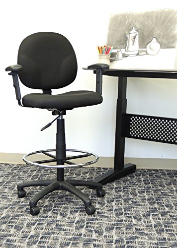 Equipped with a large 27" nylon base for optimum stability, the Boss Black Fabric Drafting Stools With Adjustable Arms & Footring by Boss Office Products offers a modern design that matches any workspace. The contoured back works to support the spine and hooded double-wheel casters make it a cinch to move the chair around the room as needed. There is a pneumatic gas lift for adjusting the height and arms to move into your desired position. The 20" chrome foot ring also gives your feet a much-needed break. Users find this model in four fabric colors with the option to purchase model TU021 with gliders instead of casters.Contoured back and seat help to relieve back-strain