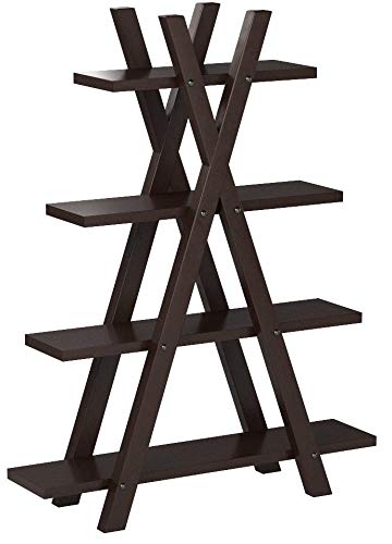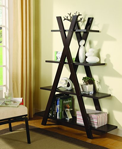 Whimsical styling creates an eye-catching look. Designed to appeal, this bookcase plays with angles and shapes to yield a practical and pretty staple for contemporary rooms. Cross-style bars join together four shelves of varying lengths that accommodate books, decor, and potted greenery. A dramatic cappuccino finish offers a bold touch and plenty of design versatility. Make this bookcase a focal point in a charming modern room.Set includes: One (1) bookcase