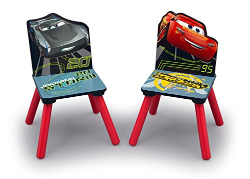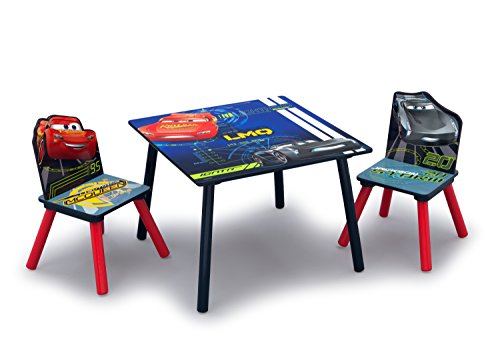 Your child will zoom towards this Disney/Pixar Cars Kids Table and Chair Set from Delta Children. Colorful graphics of the legendary Lightning McQueen and newcomer Jackson Storm bring full-throttle fun while its spacious tabletop and 2 coordinating chairs make it a multi-purpose play table ideal for a number of activities, including coloring, homework and snack time. This Kids Table and Chair Set coordinates with other items in the Disney/Pixar Cars Collection from Delta Children.