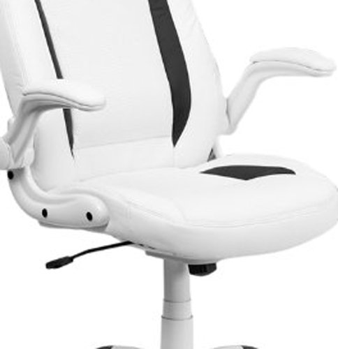 The ultra-contemporary design of this computer chair is sure to set you apart from the crowd.Leather upholstery, contrasting black inserts combine beautifully for a trend-setting style. This ergonomic chair provides built-in lumbar support and an integrated headrest to reinforce healthy posture, reducing back strain and muscle fatigue. Padded flip-up arms take pressure off your shoulders and neck, and flip up and out of the way, as needed. The swivel seat is padded with 3 inches of CA117 fire retardant foam and has a waterfall edge designed to relieve pressure and promote healthy blood flow to your legs. Use the tilt tension adjustment knob to increase or decrease the amount of force needed to rock and recline. Lock the seat in place with the tilt lock mechanism. Raise and lower your seat height using the pneumatic seat height adjustment lever, conveniently located under the seat. The heavy-duty, white nylon base with black endcaps and dual wheel casters makes it easy to roll across the floor.Whether it's a day filled with meetings or you're working to beat a tight deadline, this stylish chair will keep you comfortable throughout your busy day.Contemporary Office Chair