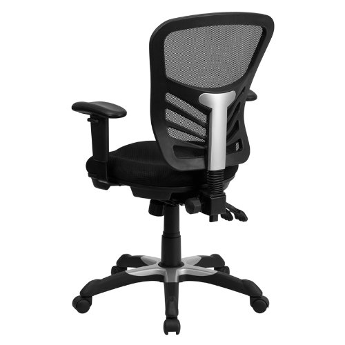 This attractive office chair is loaded with options to maximize your comfort and productivity.The transparent mesh back allows air to circulate, keeping you cool no matter how high the pressure gets. Built-in lumbar support helps prevent back strain and you can adjust the back height a full 2 inches up and down. Easily adjust the seat's back angle, seat height and tilt angle using three paddle mechanisms conveniently located under the seat.The contoured padded swivel seat is filled with 2 inches of CA117 fire retardant foam. Height adjustable padded arms take pressure off your shoulders and neck. Turn the tilt tension adjustment knob to increase or decrease the amount of force needed to rock or recline. Lock the seat in place with the multi-tilt lock mechanism. The heavy-duty, nylon base with silver accents and dual wheel casters makes it easy to roll across the floor.This mesh executive chair is a stylish chair that will keep you cool and comfortable.Contemporary Office Chair. Infinite-Locking Back Angle Adjustment