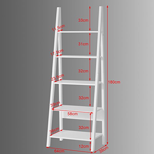 High quality material and stable frame makes the shelf suitable for a variety of locations, like living room, children room and office. Material: MDF; Dimension: W64 x D39 x H180cm(W25.20 x D15.35x H70.87in); Color/Finish: White/Varnished; Product Weight: 16.5 KGS(36.38lbs); Load Capacity:15 KGS(33.07/tier .). Easy to clean and easy to maintain. Easy to install, allowing you to quickly make the most of your space. The decorative elements are not included in the delivery. Simply elegant design wood 5 tiers storage ladder shelf bookcase.