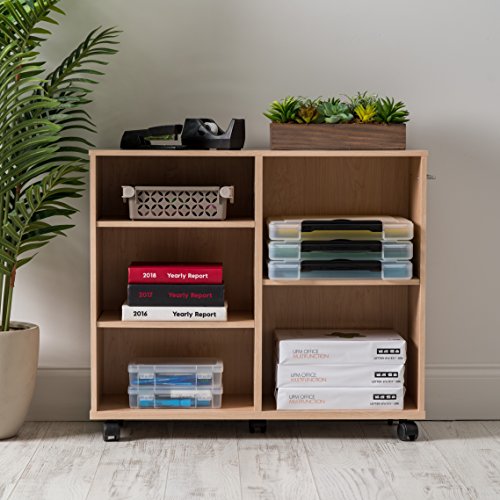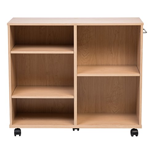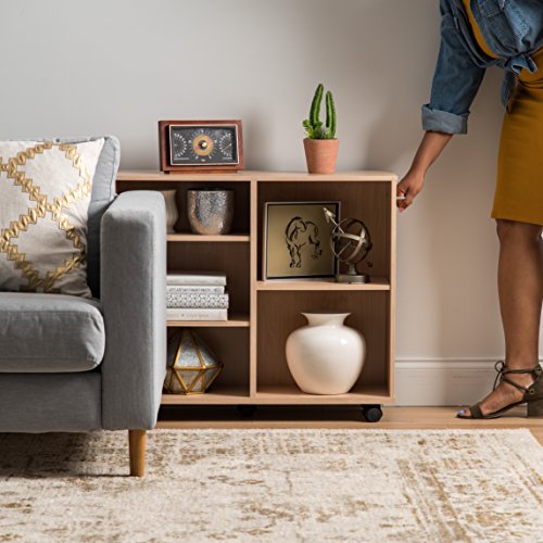 Adjustable shelving designed to meet your storage needs. Stylish storage shelves offer versatility and functionality in any room of the house. Whether you want one big shelf on one side and four smaller slots on the other or more evenly spaced storage, three adjustable shelves let you mix and match the layout of this wide wooden shelving unit. Sturdy handle can be mounted on either side of the shelving unit to improve portability. When you want to switch things up, this bookshelf with wheels glides easily where you need it. Rolling shelving unit can hold up to 105 lbs.Easily adapt your storage space with this wide wooden bookshelf with adjustable shelves