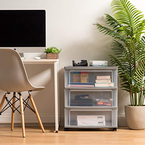 This durable 3 drawer wide chest by IRIS USA. Is the portable solution to any storage need. Quickly access contents with the easy-pull drawers. Built-in drawer-stops mean drawers won't be falling out when opened. Removable Casters make it easy to move the chests from one place to another, working with your changing design needs. Perfect for everything from clothing to linens to toys and more. Made in the USA.The perfect storage solution for any room in the house