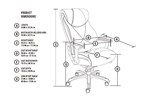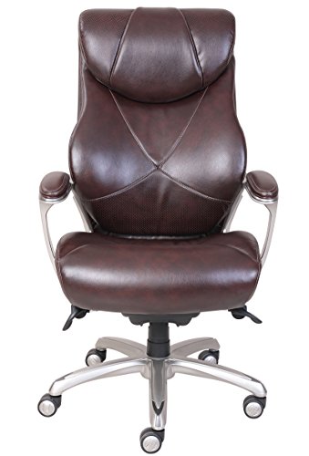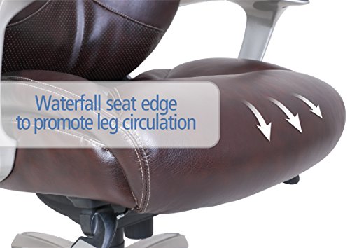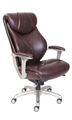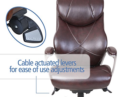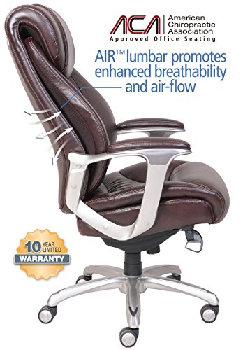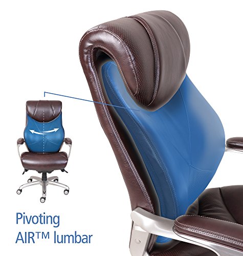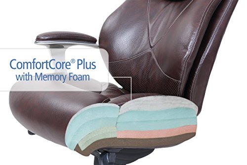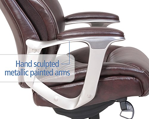 The La-Z-Boy Catania Executive Office Chair - Coffee uses AIR lumbar technology with a pivoting design to improve posture and reduce discomfort, all while enhancing breathability and air flow, too. The waterfall seat edge helps promote leg circulation, while ComfortCore Plus memory foam, complete with a poly-fiber top layer, offer the coziest work day you've ever had. The hand-sculpted metallic arms are finished in a moonshine color, a perfect pairing for the coffee-colored bonded leather upholstery. Approved by the American Chiropractic Association. Dimensions: 26.5W x 32D x 44.25 - 46.25H in.. Seat height: 20.5 - 22.5 in.. Cover constructed of bonded leather. Cover coffee colored. Frame in moonshine finish. Uses AIR Lumbar technology to improve posture and reduce discomfort. Center made of ComfortCore Plus memory foam. Plush poly-fiber top layer. Part of the Wellness by Design series.ComfortCore Plus with Memory Foam advanced layering system provides plush cushioning and optimal firmness for exceptional support and comfort