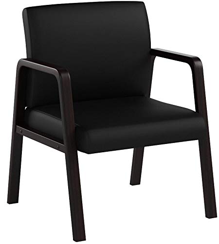 Guest chair offers ideal guest seating with thick cushions, a wood frame and black bonded leather upholstery. Seat cushion is 3-16/17" thick while the back cushion is about 4-3/4" thick. Solid wood frame features front and back cross bars under seat for extra durability and strength. Four-leg, nonskid base is equipped with adjustable leg sliders for leg leveling. Chair also features fixed armrests to add to your comfort. Weight capacity is 250 lb. Seat measures 20-7/8" wide x 17-3/8" deep. Back size is 20-7/8" wide x 15-3/4 high.Provides perfect option for guests to sit comfortably