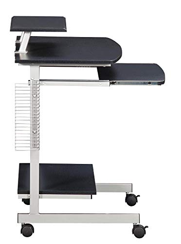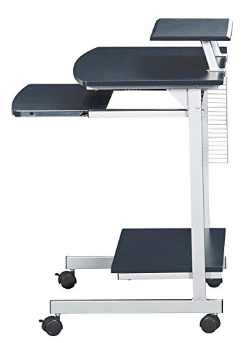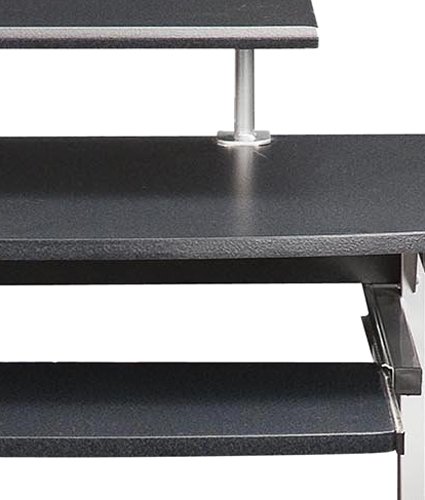 Perfect as Home Office Desk or Kids Computer Desk. Made of MDF Wood with Scratch resistant powder coated steel frame. Includes large double-wheel non-marking locking casters. Adjustable shelf to center, right or left of table. Features pullout keyboard with safety stop and monitor/printer shelf which adjusts to center, left, or right. Includes Side media & CD rack, Bottom accessory shelf, and large bottom panel to accommodate CPU and accessories. Includes a 5 Year Warrenty.Heavy-Duty MDF Panels with a Moisture Resistant PVC Laminate Vaneer in Graphite Finish