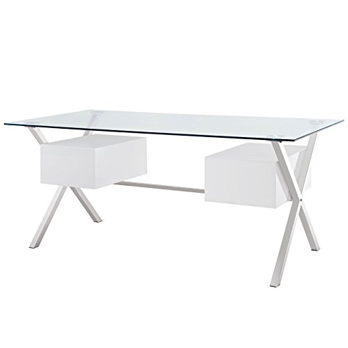 Keep your thoughts flowing with the Abeyance modern office desk. Suspended by a polished stainless steel frame, the right and left storage drawers balance an otherwise transparent piece. Outfitted with a tempered glass top, Abeyance encourages you to hold onto the thoughts that matter, and free your mind from distraction.MULTI-PURPOSE USE - Whether situated in the home office space, study, apartment, bedroom, living room, entryway or dorm room, versatility abounds with Abeyance. Make the most out of your writing area