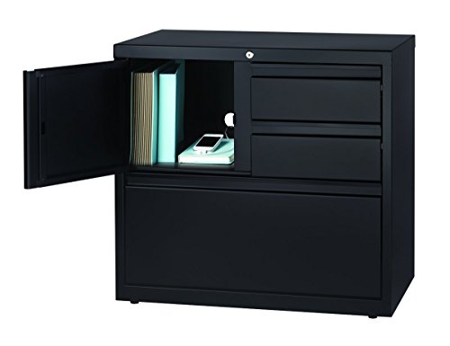 When you need space for filing, but also additional space for personal storage, the Office Dimensions personal storage cabinet is the solution. Our metal storage cabinets works great in office environments, and at 28" high, it fits under most desk or work surfaces. The personal storage cabinet includes One 12" file drawer, two 6" smaller drawers, and a shelf with door for miscellaneous storage. The shelf area on the left has a knockout back panel for cord management. The center lock secures all of the drawers and doors to keep your items protected. The file drawer features hanging rails for files and a full width drawer pull that is functional and sleek. The adjustable leveling glides makes sure that the drawers operate smoothly. This Office Dimensions products meets or exceeds ANSI/BIFMA standards and is Greenguard gold certified.28" height fits under most desks or work surfaces for additional storage
