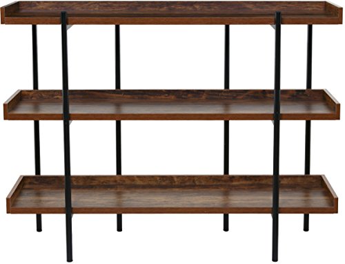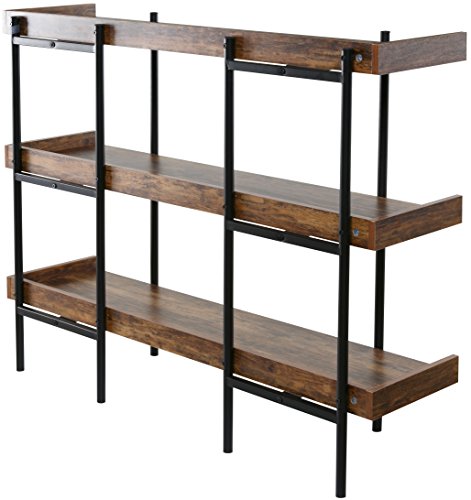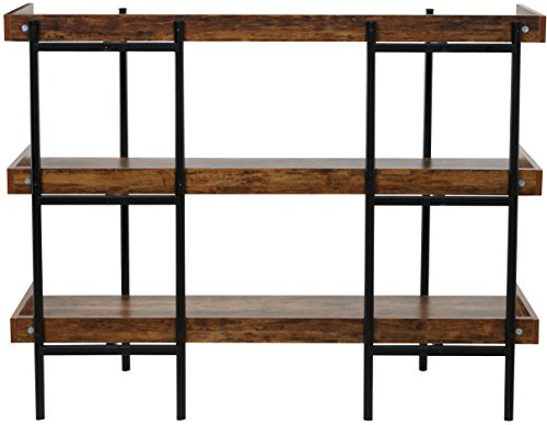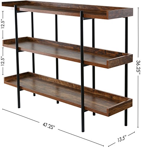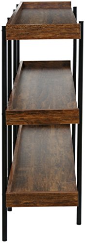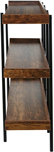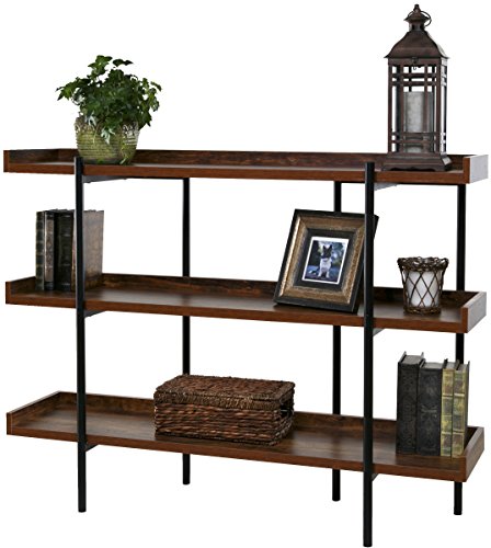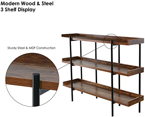 The 50-JN173SHLF modern wood and steel shelf display accentuates and shows off important items in the best possible light. Its unique Cherry wood finish on sleek, black steel design makes it a beautiful addition in a number of ways. The design is open and easily accessible to place a variety of items - delicate breakables and family photos, to awards, trophies, room accents and more. There are 3 sturdy shelves, each with extended back and sides to keep items stable and in place. The shelving is supported by a fully connected thick steel frame with 6 posts (two in front and 4 in back) for proper weight distribution and further stability. Each shelf is made of high density MDF wood, considered to perform better than real wood, and can hold up to 110 pounds. This display's sleek, modern look goes with any decor. Its durable space-saving construction makes it highly functional for the home or office. And it's available from OneSpace, part of the comfort products family. With a history dating back to 1919, comfort products makes design and innovation affordable.Distinctively ultramodern design with rich cherry shelving on sleek black steel frame
