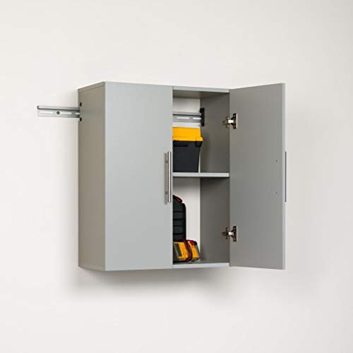 The Hang-ups 24" Upper Cabinet offers versatility for your ever changing storage needs in the garage, laundry room, office or workshop. The Upper Cabinet mounts securely to the wall with a heavy duty metal rail and hook system. The wall mounted feature ensures easy cleaning beneath the cabinets and protects your stored items from water & dirt. The Hang-ups Collection is constructed using laminated composite wood and features metal handles and adjustable hinges. This product ships ready-to-assemble and includes all hanging rails and fastening bolts. Add other cabinets from our Hang-ups Collection to create a storage system to convert any cluttered room into an organized space.Assembled Dimensions 24"W x 30"H x 12"D (4 cubic feet)