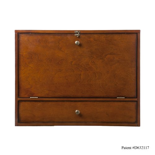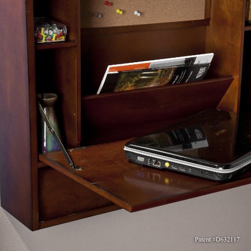 An ideal solution for any room, this brown mahogany, wall mount laptop desk folds away neat and compact. Fold the desk down and you reveal a convenient storage area with shelves, bill organizers and a corkboard. The desk is finished out with a useful drawer to store away pens, pencils, and anything else you may want to keep out of sight. Whether you choose to use this in your home office, living room, or dorm, you are sure to be pleased with the amazing functionality of this fold out desk. This small-space friendly wall mounted profile includes 4 compartments, 1 angled paper organizer, 1 corkboard, and 1 drawer total. Dimensions include: Overall: 26" W x 6" D x 20" HWriting surface: 24.75" W x 13.5" D; Large cubby: 16.5" W x 5.5" D x 13.75" H; Medium cubbies: 3.75" W x 5.25" D x 8.75" H; Small cubbies: 3.75" W x 5.25" D x 4.25" H; Drawer: 24" W x 5" D x 3.25" HThis one-of-a-kind item approximately weighs 29 poundsand can . Only quality materials and manufacturing will do. Product materials include: MDF, wood veneer, metal. Assembly: Required. Made in China.Wall mounted desk features four compartments, one angled paper organizer, one corkboard, one drawer, and a fold-down desktop