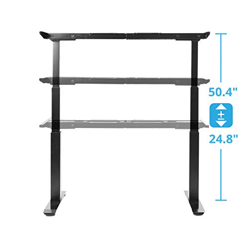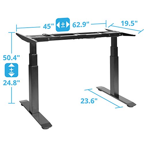 Discover the benefits of getting active during your day with the AIRLIFT S3 Electric Height-Adjustable Standing Desk at home or in the ofice. Upgrade with a desk that encourages an active lifestyle and can help reduce the unhealthy sedentary behavior in your day. With a press of the AIRLIFT buttons, dual electric motors adjust the height from a minimum of 24.8 inches high to a maximum height of 50.4 inches high. Steel construction throughout gives the desk stability and durability through repeated uses. Save up to 4 height settings on the memory buttons and adjust to the perfect height throughout the day with the height controller. An LED display lets you know how high the desk is as it rises and descends. Assembly is easy and can be done in minutes with the included tools. The base is designed to pair with Seville Classics Ergo Table Top; they bolt together without additional drilling or modification. Adjust the width of the desk from 45 and 69.2 inches wide for use with non-Seville Classics tops. Desk base is finished in black. Use it as a home desk replacement, or an instant upgrade to office spaces for large and small businesses.