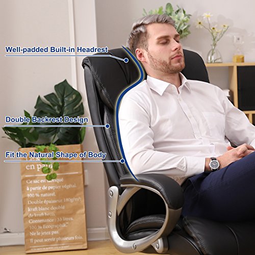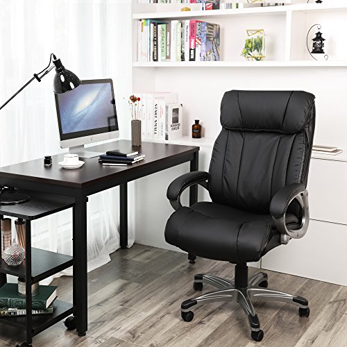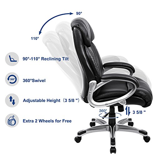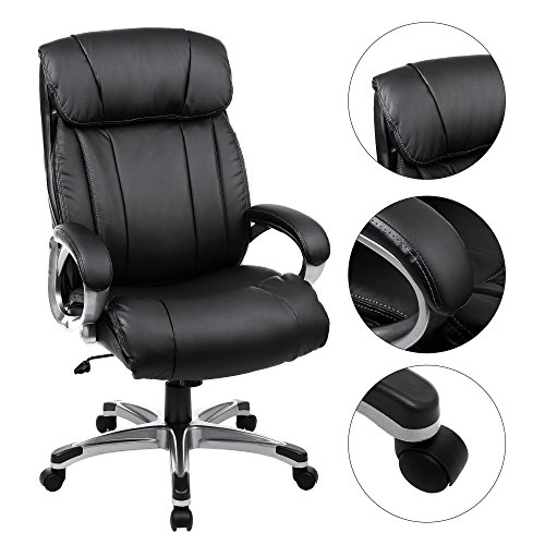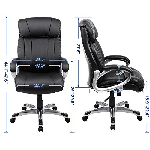 With this SONGMICS office chair, you will be as comfortable as sleeping in bed while sitting for a long time or taking a quick nap. It offers multiple supports for your head, lumbar, hips, and legs. Wide and large size as well as double padding cover that's made of wear-resistant and eco-friendly synthetic leather that feels like leather to make this desk chair luxuriously comfortable. Specification: - Overall Height: 44 1/8''- 47 5/8'' (112-121cm) - Overall Width: 25 1/4'' (64cm) - Overall Depth: 28 3/4'' (73cm) - Adjustable Seat Height: 18 7/8''- 22 1/2'' (48-57cm) - Seat Size: 20 7/8''L x 21 1/4''W (53 x 54cm) - Back Height: 27 1/2'' (70cm) - Front Cushion Thickness: 6 1/4'' (16cm) - Base Diameter: 27 1/2'' (70cm) - Color: Black - Gross Weight: 44.09lbs (20kg) - Max. load Capacity: 330lbs (150kg) Material: - Five-star Casters: Nylon + Lacquer Spray - Armrest Bars: Nylon + Lacquer Spray - Armrest Surface: PU + Foam - Backrest: PU + PVC - Seat: PU + PVC - Wheels: Nylon Package Contents: 1 x SONGMICS Office Chair 1 x Instructions 1 x Set of FittingsUPHOLSTERED CUSHION WITH INNERSPRING FOR SUPERIOR COMFORT: Cushion built-in with inner-spring; front thickness of 6 1/4''; wear-resistant surface of the executive chair of eco-friendly synthetic PU; the headrest, backrest and armrests are luxuriously upholstered with high-density organic polymer foam ; provides body-hugging comfort making you feel like you are sitting on a sofa