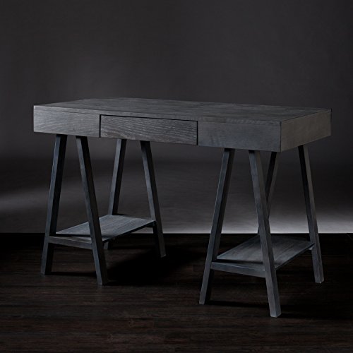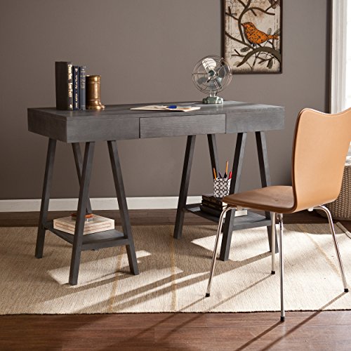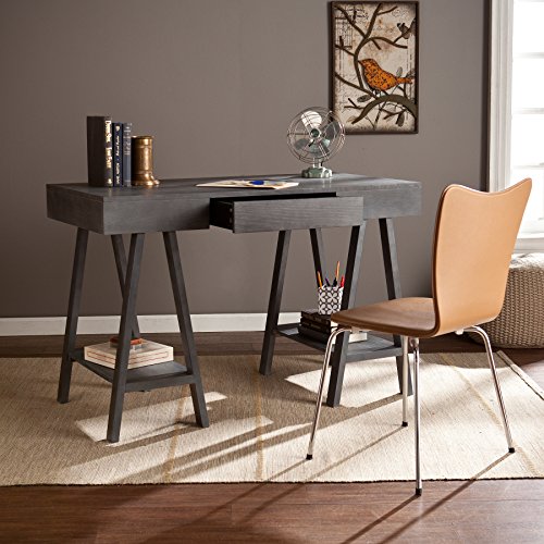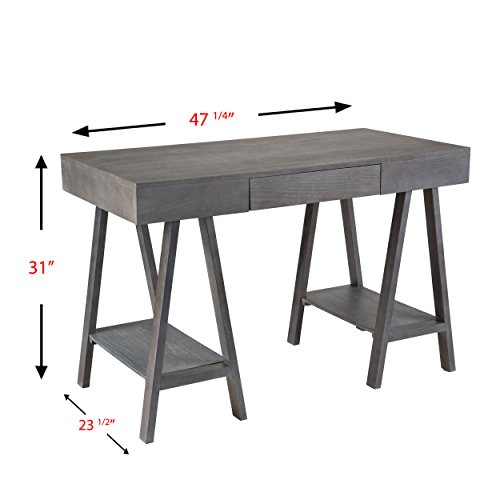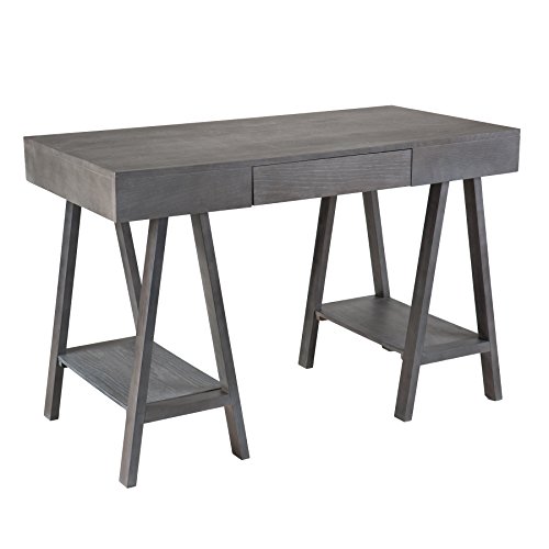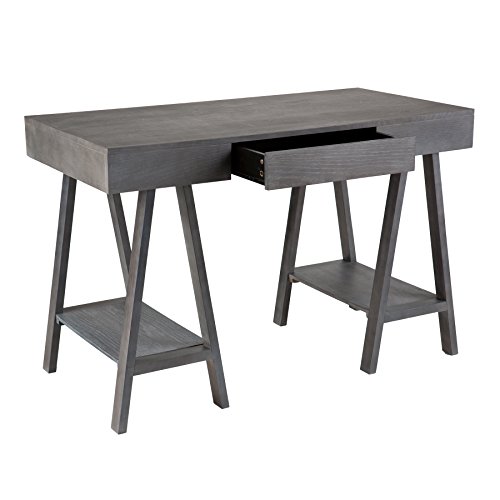 For effortless workspace, add this architectural desk with midcentury modern styling to your home. This structural, gray washed desk features a broad writing surface supported by Sawhorse style, A-frame legs. Two open shelves offer accessible storage or decorative display space while the drawer tucks away office necessities. Works well in any home office or writing area.This desk features 1 drawer and 2 shelves for help with your organizational needs