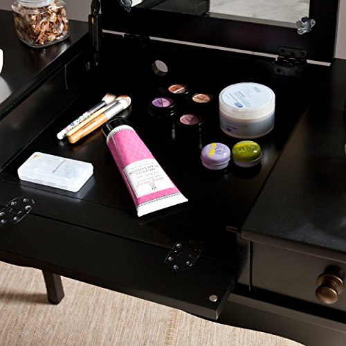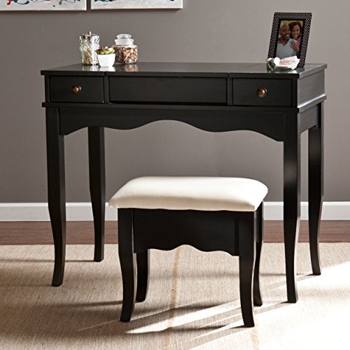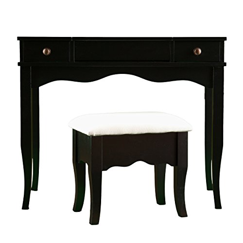 Prepare for the day in your own personal area with this graceful vanity and matching bench. A functional, fold down mirror provides usable center space whether open or closed. Store makeup and other items in the two drawers while arranging necessities on top for a sleek and organized display, and close mirror for a quick tidy up that acts like a third storage! Its sophisticated black finish, ivory seat, and slight curvature evoke a soft, romantic feel. Convenient fold down mirror adds tabletop space and hidden storage, as needed. This set features 2 drawers for concealed storage and 1 cord management opening and bench has internal storage and a seat hinged lid for easy access. Lid includes safety hinges that prevent slamming. Dimensions include: Overall: 36.5" W x 18.5" D x 30.5"/48" H (closed/open); 18.25" W x 12.5" D x 17.5" H; Tabletop: 17.25" W x 18" D x 30.5" H (center), 9.25" W x 18" D x 30.5" H (sides); Mirror: 13.75" W x 13.75" H; Drawers: 6.75" W x 13" D x 2.25" H; Storage: 16.75" W x 16.25" D x 3" H (vanity), 11.5" W x 9" D x 4" H (bench); Cushion: 2" THK; Chair/leg room: 31.75" W x 17" D x 21.5" H; Clearance: 31.75" W x 13.25" D x 21.5" H (vanity), 13.25" W x 7.25" D x 9" H (bench). This one-of-a-kind item approximately weighs 68 pounds and can support up to 50 pounds (total tabletop), 20 pounds (per tabletop side), 10 pounds (per drawer), 250 pounds (bench). Only quality materials and manufacturing will do. Product materials include: Rubberwood, MDF, Veneer, Plywood, Polyurethane Foam, Cotton, Metal. Assembly required. Made in Vietnam.Fold down mirror adds tabletop space and hidden storage; Features 2 drawers and 1 cord management opening; Includes 1 vanity table and 1 bench