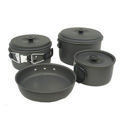 This unique line of lightweight and extremely durable cookware features hard anodized aluminum construction, making camp cooking a breeze.Features:- Lightweight, extremely durable cookware with great heat conduction- Tough enough for any expedition- Easy-clean coating on the interior of the pots and frying pan- All components nest together into a compact packageSet Includes:- 1 qt. kettle/pot with lid/strainer and folding handles- 1.5 qt. pot with folding handles and lid- 2.1 qt. pot with folding handles and lid- 7.5"" frying pan with folding handles- Nylon stuff sackmanufacturer no: 41420bar code: 774552414201manufacturer : Chinookshipping dimensions: weight: 2.25 dimensional weight: 5 (w) x5 (h) x7.5 (d)New