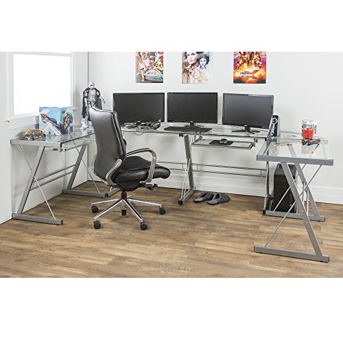 This contemporary desk offers a sleek modern design crafted with durable steel and thick tempered safety glass. The L-shape provides a corner wedge for more space and the design creates a look that is both attractive and simple. Flexible configuration options allow you to mount the keyboard tray on either side of the desk. Also included are a universal autonomous CPU stand and a sliding keyboard tray. This desk compliments any room and is a great addition to any home office.Polished and beveled, tempered safety glass