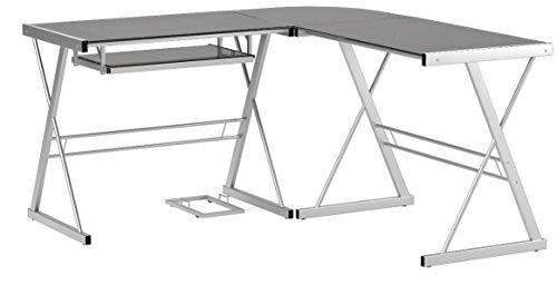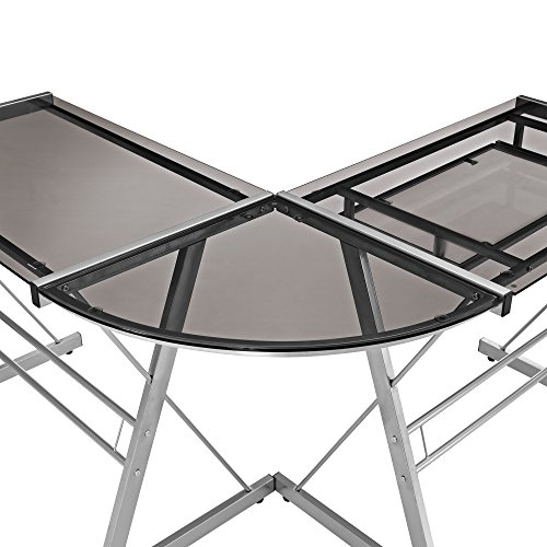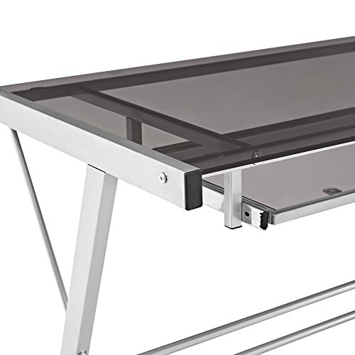 Description: Modernize your home office or study with this corner computer desk. Crafted from durable steel with a powder coat finish and thick, tempered safety glass. The L-shape provides the perfect corner wedge for space-saving needs and features a sliding keyboard tray and CPU stand. Its flexible configuration allows you to mount the trey on either side of the desk to fit your needs. Features: • Stylish, sturdy design • Available in many color variations • Polished and beveled, tempered safety glass • Durable steel frame with powder coat finish • Sliding keyboard tray can be mounted on either side • Can separate into two desks • Space-saving L-shape design • CPU stand included • Ships ready-to-assemble with step-by-step instructions Dimensions: 51" W x 20" D x 29" H (Overall Depth: 51") Weight: 57 lbs.Polished and beveled, tempered safety glass