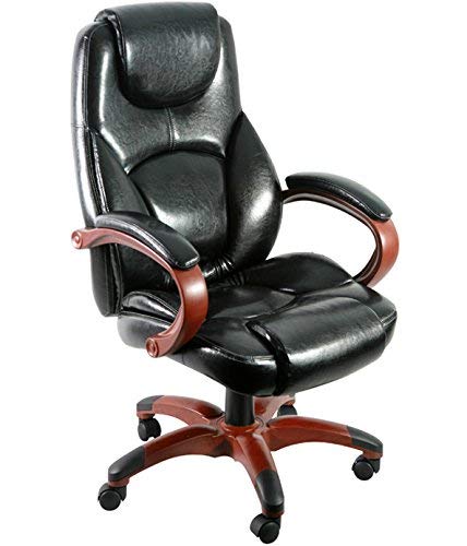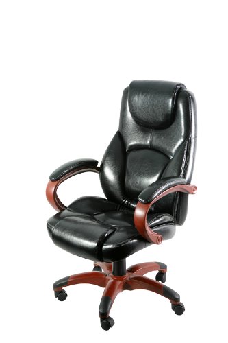 This executive chair has a contour seat and back with built in lumbar support and pneumatic seat height adjustment. It features black bonded leather and matching upholstered armrests. It also has a butterfly seat plate with a padded cushion and a durable 5 star wood toned base with scuff resistant caps.Contour seat and back with built in lumbar support
