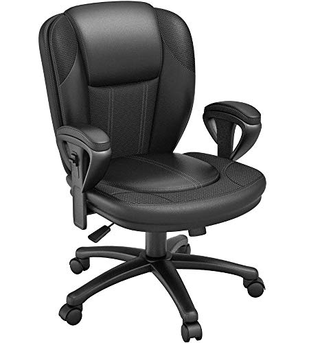 This manager chair has a contour seat and back with built in lumbar support and pneumatic seat height adjustment. It features black bonded leather and flip up arms. It also has a butterfly seat with a padded cushion and a durable 5 star black finished base.Contour seat and back with built in lumbar support