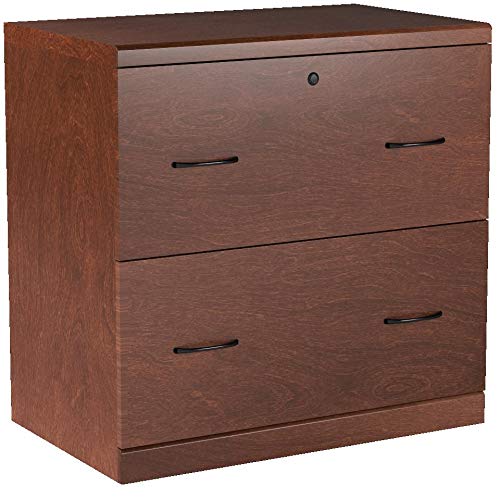 This two drawer lateral file cabinet has a cherry finish with black accents. It features full extensions glides with metal rails for easy filing. The file drawer accommodates letter and legal size hanging files. Includes lock for security. Ideal for any home and/or office.Finished In Cherry With Black Accents