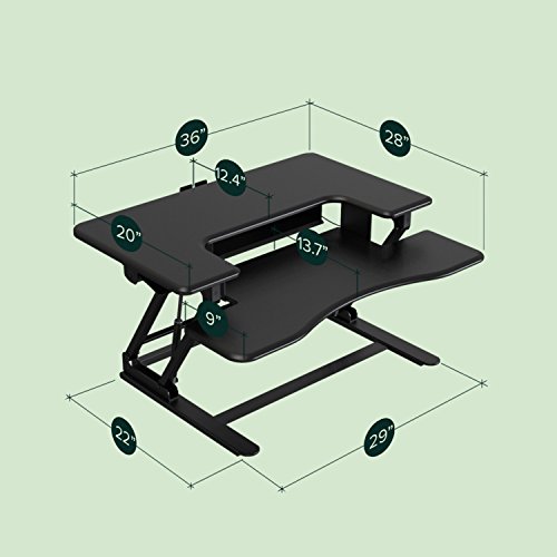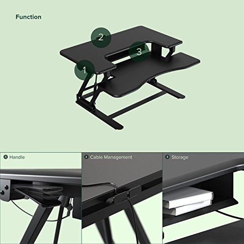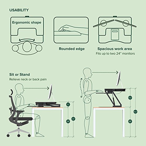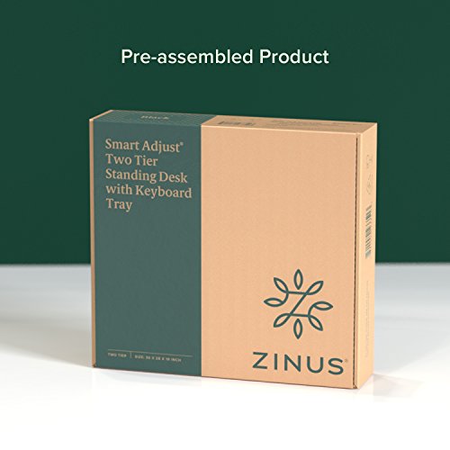 Standing and moving while you work is better than sitting and can help you be more productive. Instantly convert any flat work space from a sitting to standing desk in seconds. Just squeeze the handles on each side to raise or lower the desktop. Once you find your desired Height, release the handles, and your desktop will lock into position. With a large work surface area and second level key board tray, organizing your new workspace will be easy. Enjoy all the benefits of a Zinus smart adjust standing double desk.Ergonomic sit-stand desk with a top surface that fits two 24" monitors, a 2nd level keyboard tray, and even room for storage